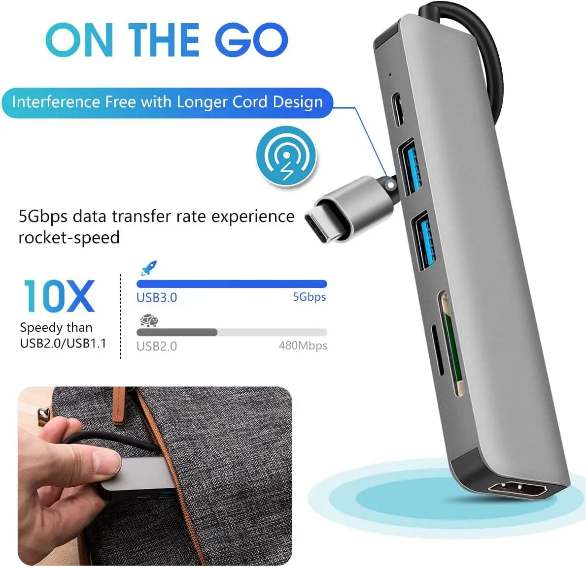 This versatile 6-port USB-C hub significantly expands your device's connectivity while maintaining a compact and portable design. It features multiple USB-C and USB-A ports for simultaneous connections of storage devices, peripherals, and accessories, alongside built-in SD and microSD card readers that support high-speed data transfer. The sleek aluminum construction not only ensures durability but also effectively dissipates heat during extended use. With plug-and-play functionality, this hub requires no additional drivers or external power for most devices, making it an ideal travel companion for laptops, tablets, and smartphones.